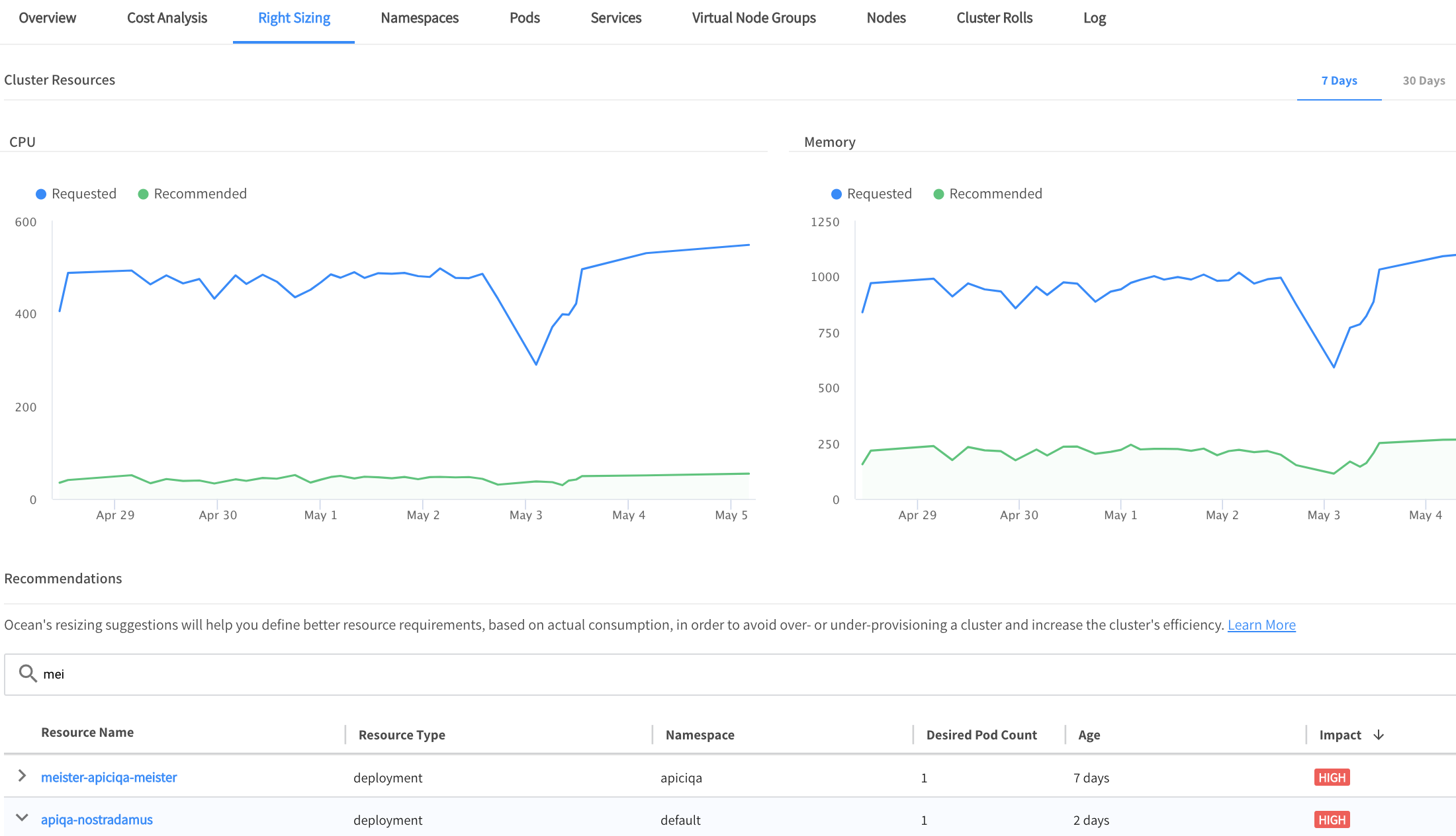 Resource suggestions will be provided to help you adjust deployment requests to actual resource usage per CPU and Memory. Resource resize recommendations are triggered if the requested resources are 15% above or below the average metric during the last two weeks.